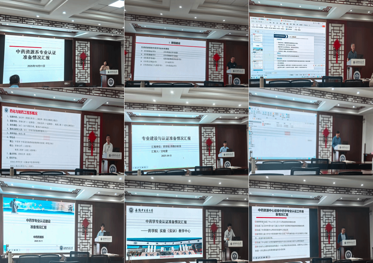 随后,中药资源系、生药系、中药与天然药物化学系、药化与制药工程系、药物分析系、药剂系、中药药理系、实验(实训)教学中心、中药资源中心等各系(中心)等与中药学专业建设相关的系与中心依次就师资队伍建设、学科建设、课程建设、教育教学改革亮点工作和认证准备情况进行了详细汇报。